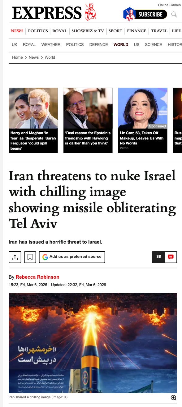 The article, titled “Iran threatens to nuke Israel with chilling image showing missile obliterating Tel Aviv,” appeared on Express.co.uk on March 6, 2026, authored by reporter Rebecca Robinson.