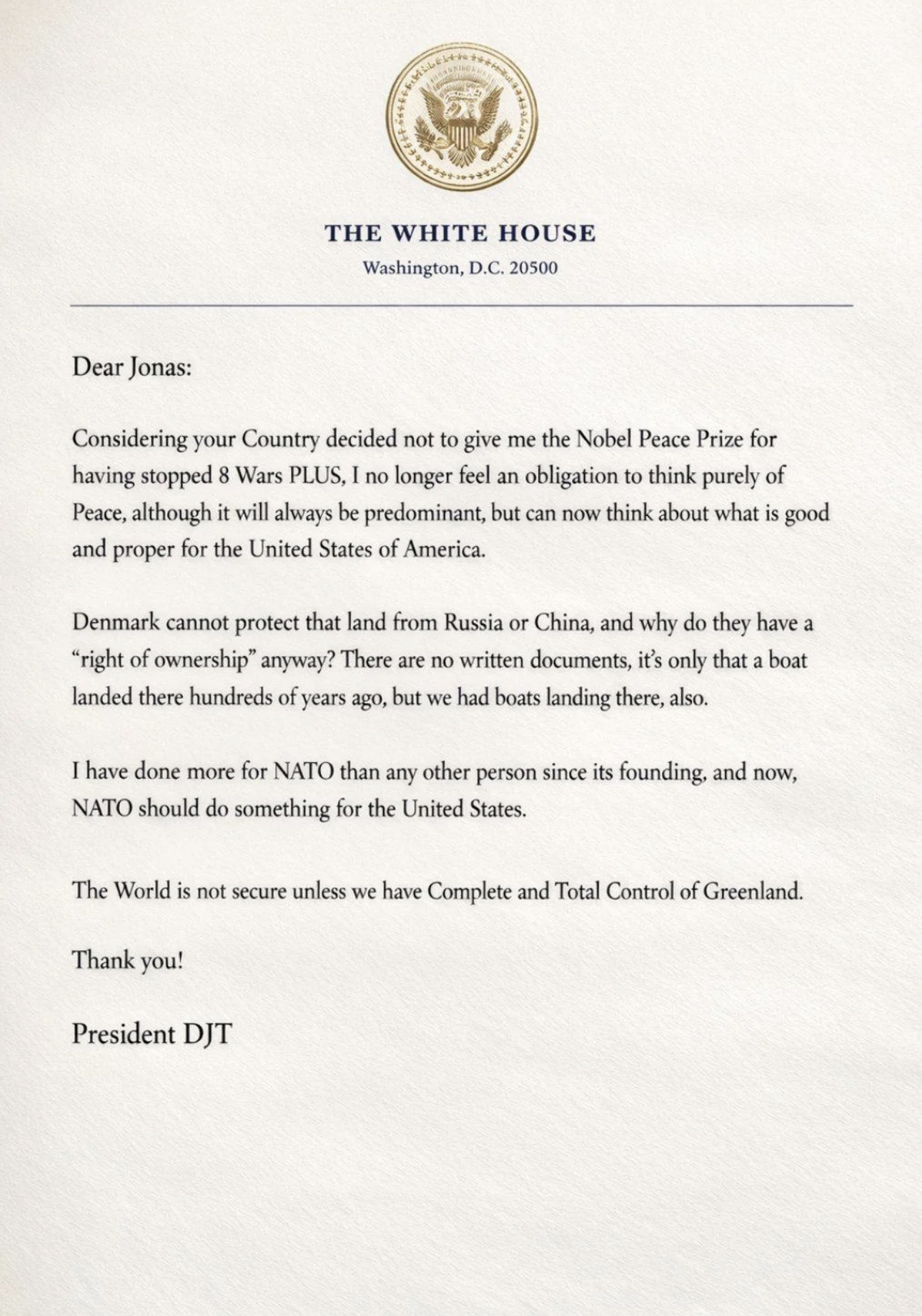 Trump’s letter, addressed informally to “Jonas,” reportedly dismisses Denmark’s “right of ownership” over Greenland, arguing, “[t]here are no written documents, it’s only a boat that landed there hundreds of years ago, but we had boats landing there, also.”
