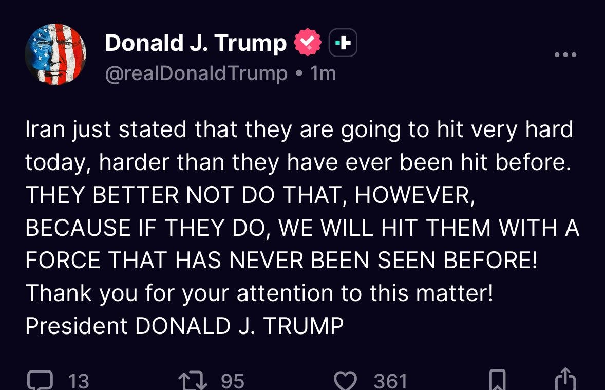 By Sunday, President Trump posted on social media that if Iran hits harder than they have ever hit before, then the U.S. “will hit them with a force that has never been seen before!” This implies a U.S. response will be more than proportional.