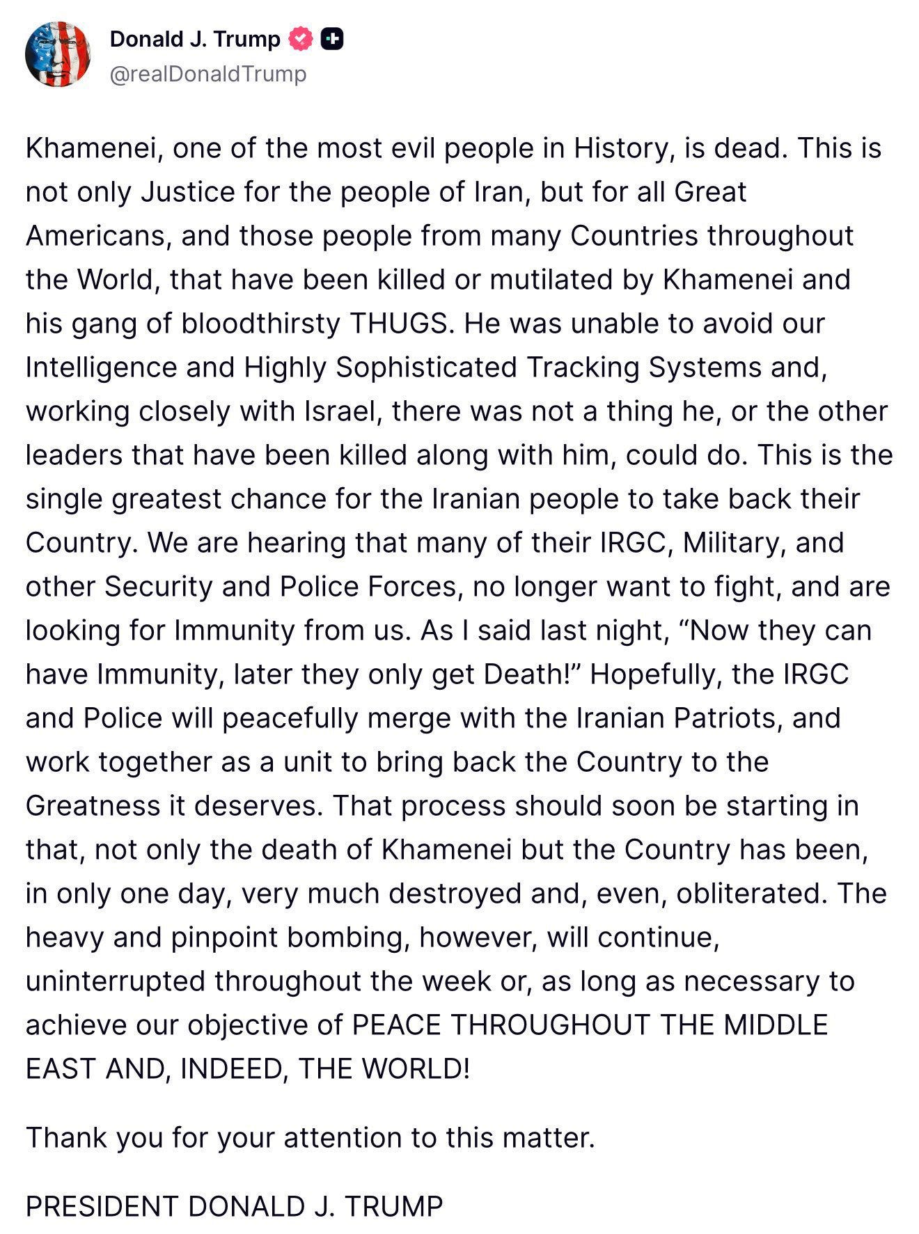 Later on Saturday, Trump announced on his social media platform Truth Social, that Ali Khamenei had died. “He was unable to avoid our Intelligence and Highly Sophisticated Tracking Systems and, working closely with Israel, there was a not a thing he, or the other leaders that have been killed along with him, could do,” Trump wrote.