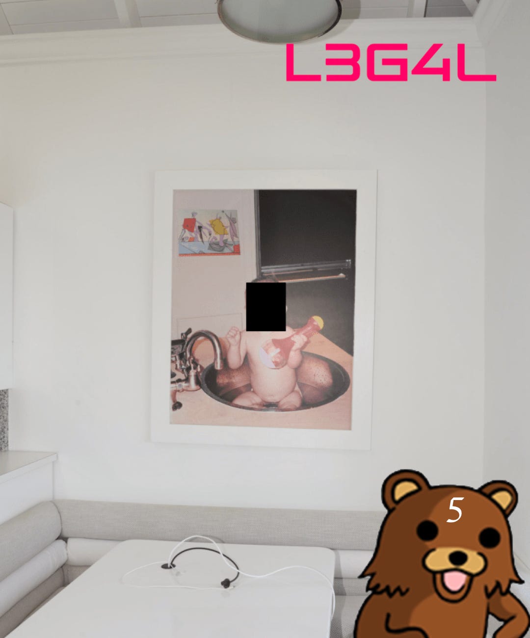 This redacted photo was recently released by the DOJ. It depicts a naked baby bathing in a sink. The photo was framed and hung in the main kitchen of Epstein’s Little St. James island. The DOJ released other photos of the kitchen that show the baby’s face without redactions.