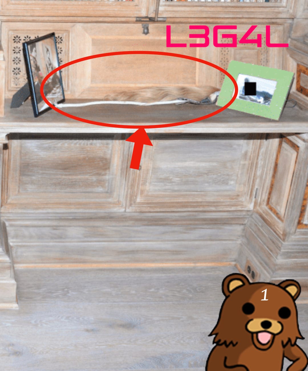 This photo was taken by the FBI at Little St. James Island. On the shelf is what appears to a large swath of an unknown blonde girl’s hair. Surprisingly nobody is talking about this on social media. Next to the swath, in a green frame, is a redacted image of one of Epstein’s victims in the cockpit of plane. The hair is presumably hers. This is by far the most unusual item.